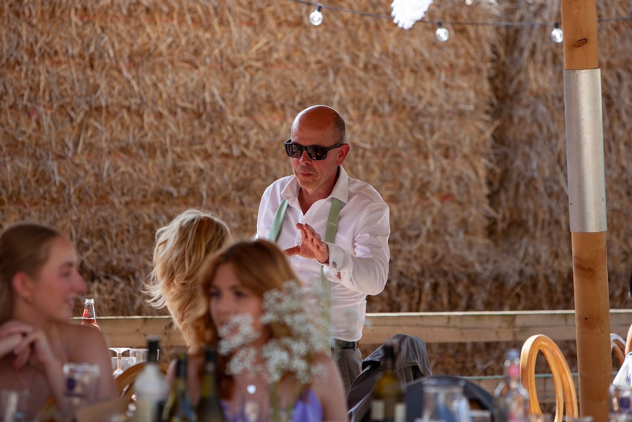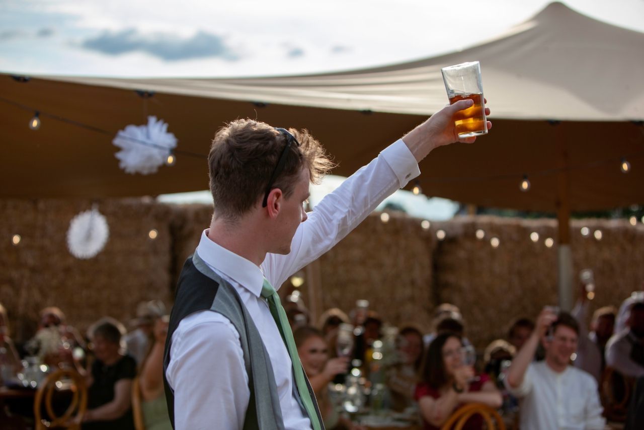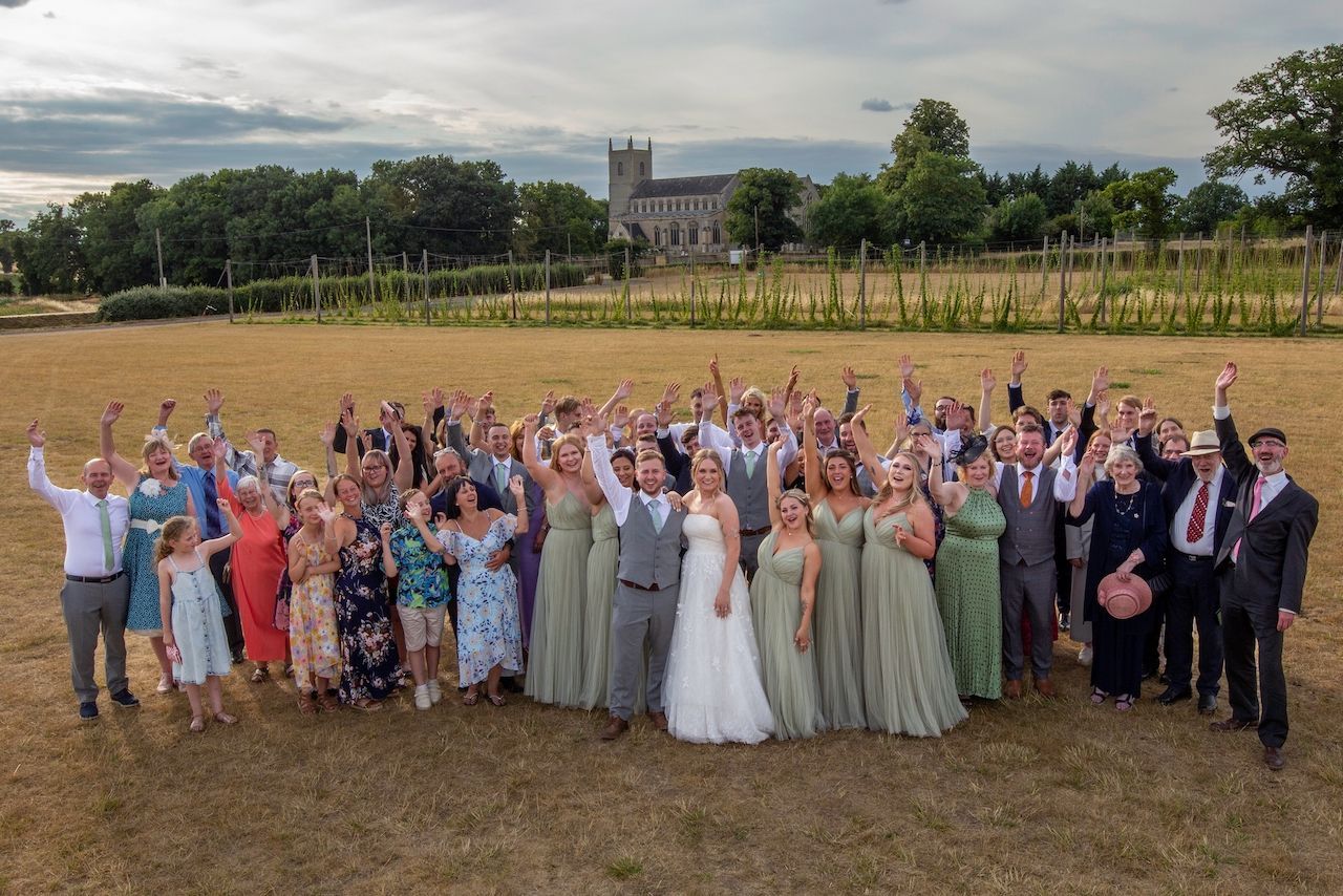 I had a chance meeting with Jodie & James to begin this story, at the time I was hosting a black tie charity ball at Lynford Hall in aid of the St Nicholas Hospice Bury St Edmunds when Jodie introduced herself by my wife who knew her previously from her own charity work. Jodie explained that she was in the midst of planning a very unique affair, a music festival inspired wedding in the nearby village of Weeting. After outlining her vision for the day my face must have been a picture! thankfully I landed the gig of photography. The day of the wedding… The Sun was shining for Jodie, I remember arriving at her parents’ house which was a hive of activity, so many bridesmaids, flowers and wellie boots! When Jodie was ready she looked beautiful, a brilliant white dress and the perfect addition of flowers in the form of a bouquet and a flower crown in her hair, everyone looked very festival chic. Jodies father and James had put months of work into the preparations for the wedding, leading up to and including the morning of. when I arrived at the venue it blew me away, a miniature Glastonbury had indeed been created. Flags fluttered in the breeze and the wedding guests made their way through them to a Tee Pee centre stage surrounded by straw bales. The bridal party arrived together in style on a tractor and trailer. The ceremony was truly magical, and everyone enjoyed the day listening to music surrounded by food vendors and entertainers, The highlight of my day had to be photographing the couple crowd surfing into the sunset.  Here are a few images from an extraordinary day…